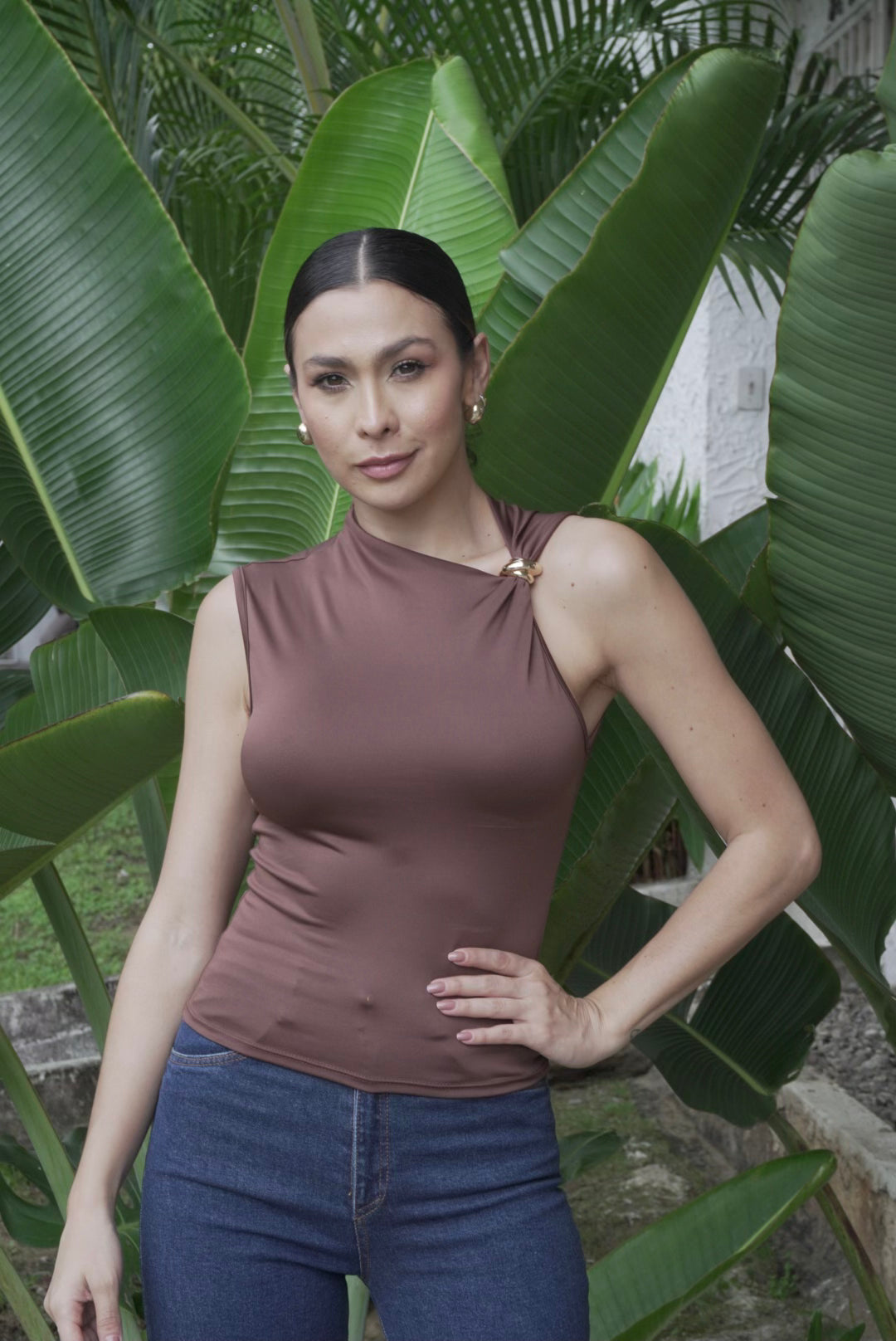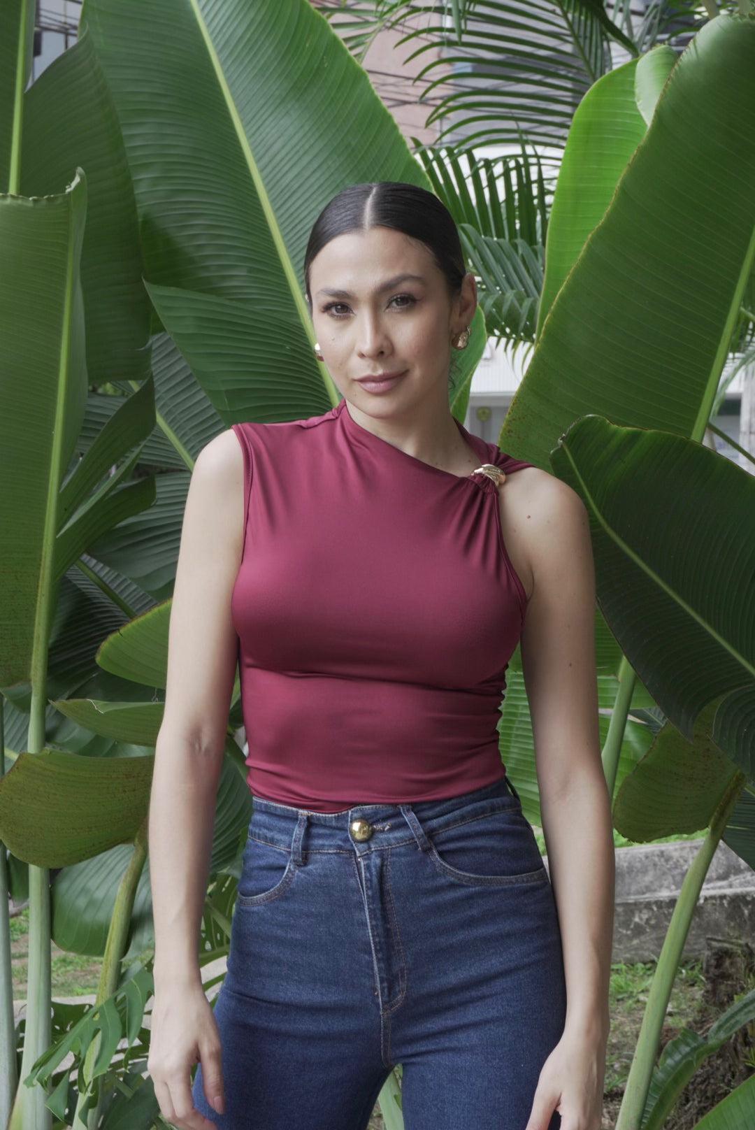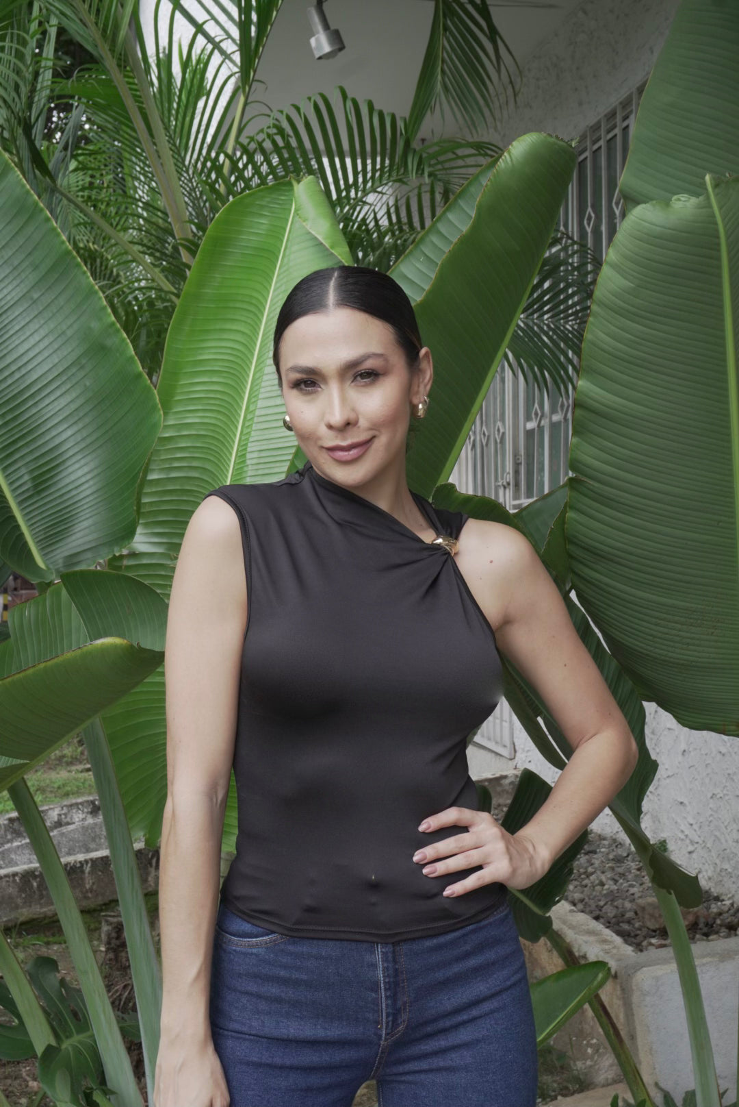 Blusa en tela suave y elástica con diseño asimétrico y detalle metálico en el hombro. Ajuste cómodo y favorecedor, ideal para looks casuales o elegantes.