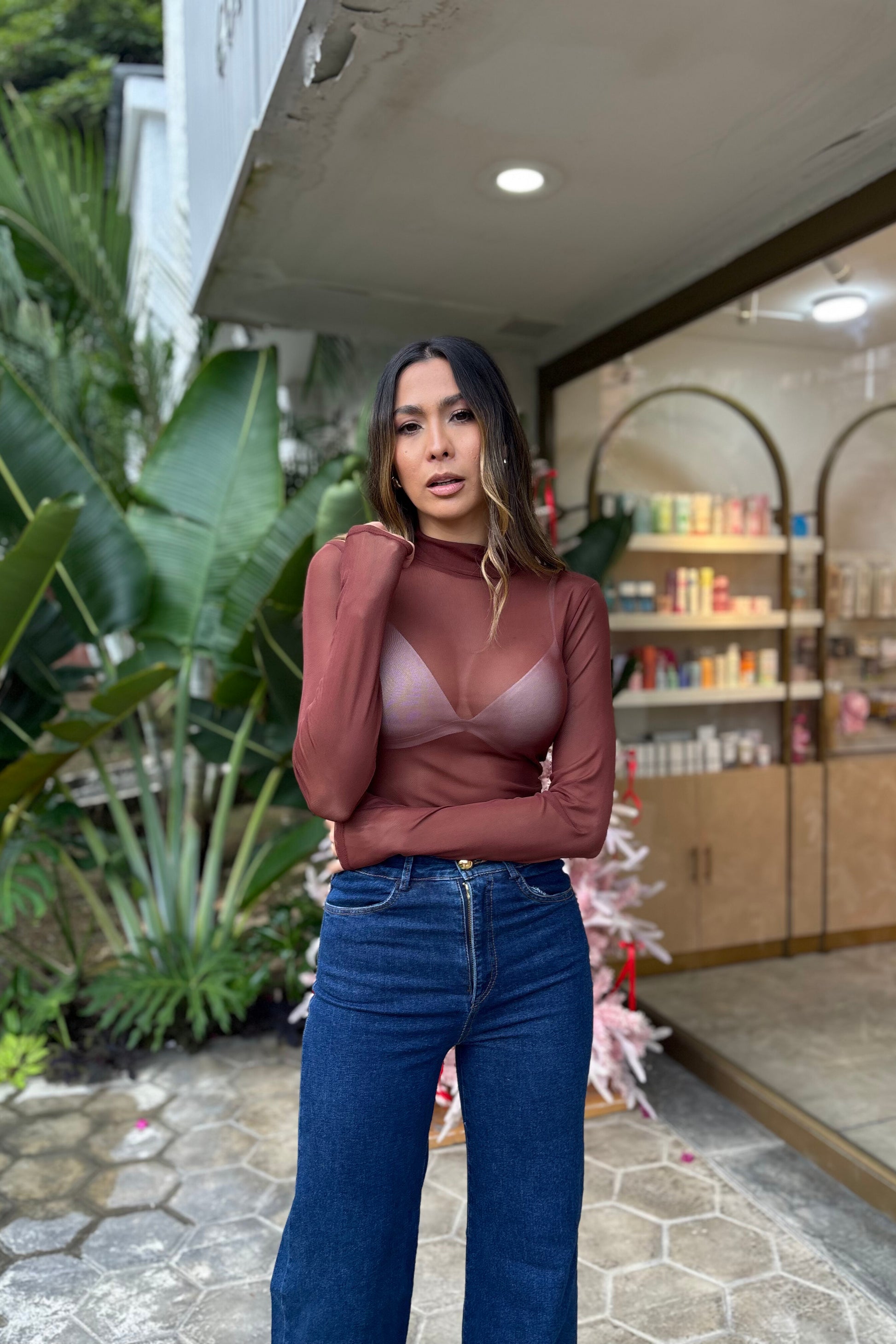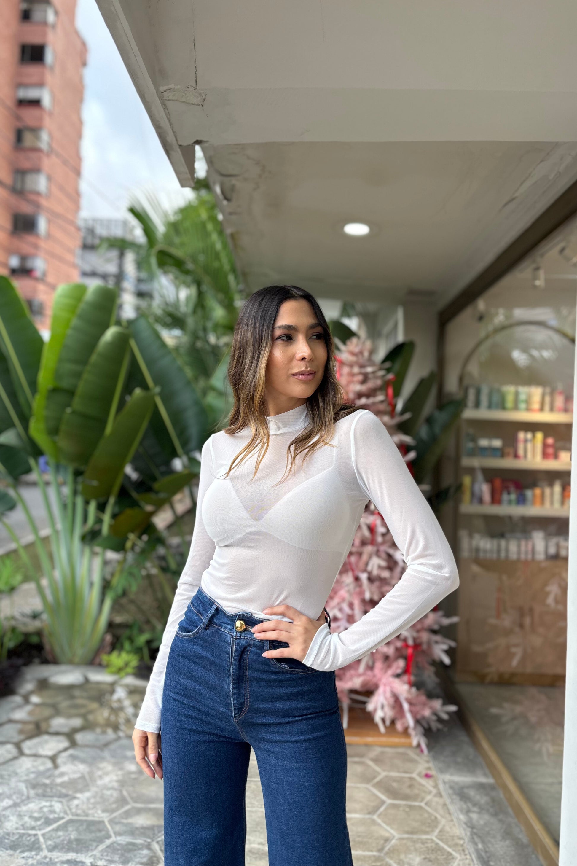 Body manga larga en malla translúcida de color blanco Y marron, con cuello alto suave y ajuste ceñido que realza la silueta de forma elegante. Su tejido liviano y elástico ofrece comodidad y un acabado delicado, perfecto para combinar con jeans o prendas más formales. Ideal para looks frescos, modernos y versátiles.