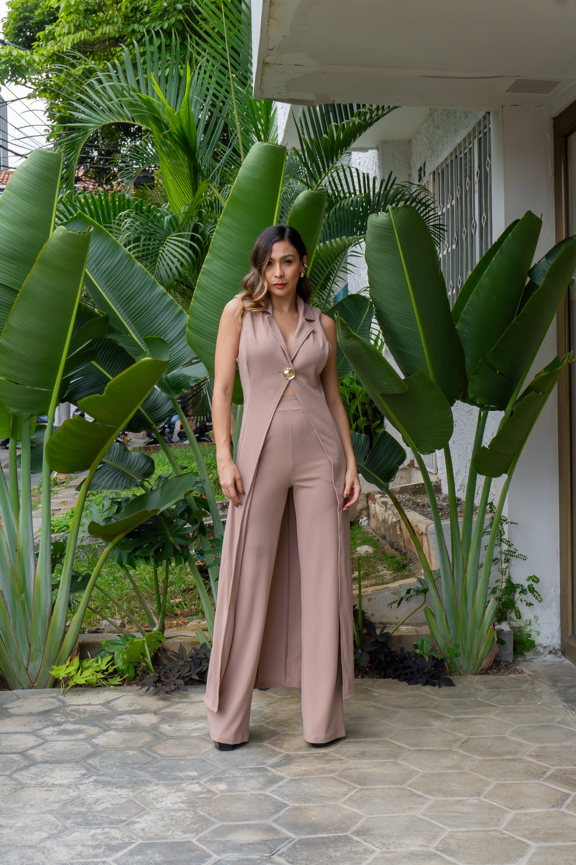 Luce sofisticada, moderna y empoderada con este set en tono arena, diseñado para destacar con un estilo minimalista y refinado. El conjunto incluye un chaleco largo sin mangas, con cuello tipo solapa y un botón dorado decorativo, que aporta un toque de elegancia y hace que la prenda se vea única y estilizada.