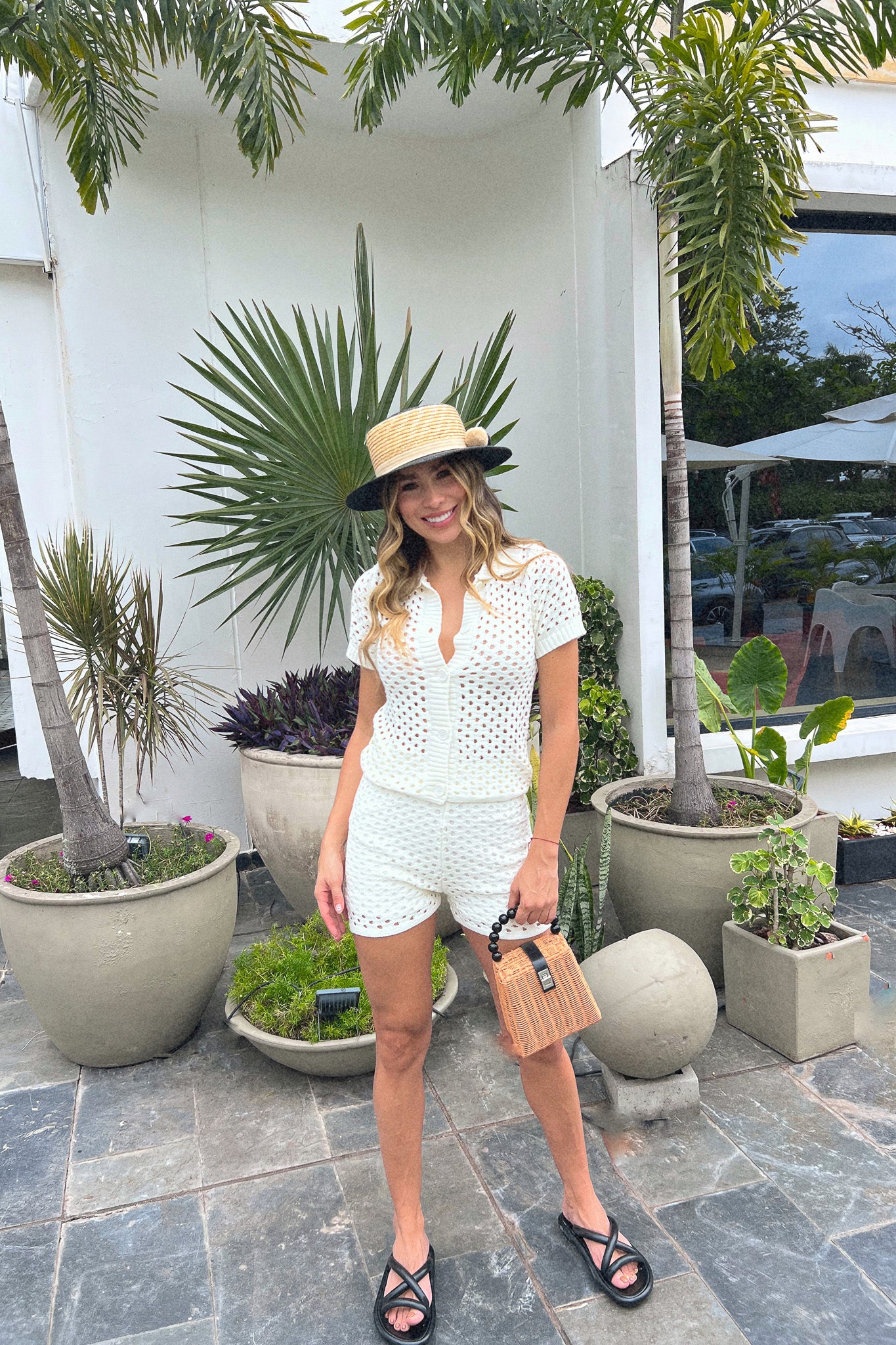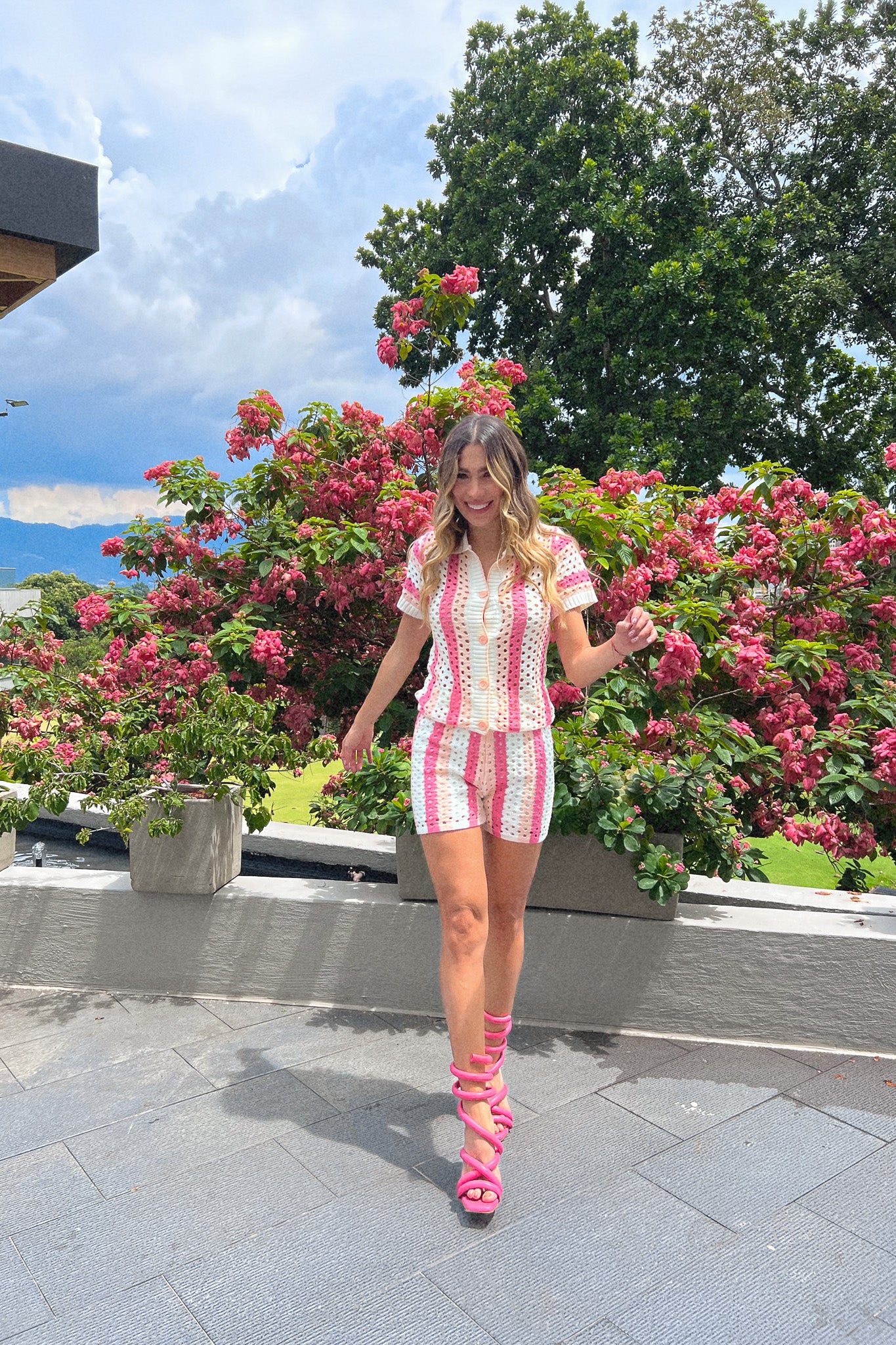 Short knit set. Includes a button-down shirt and elastic-waist shorts, ideal for fresh and vibrant looks. Perfect for sunny days and stylish casual occasions.