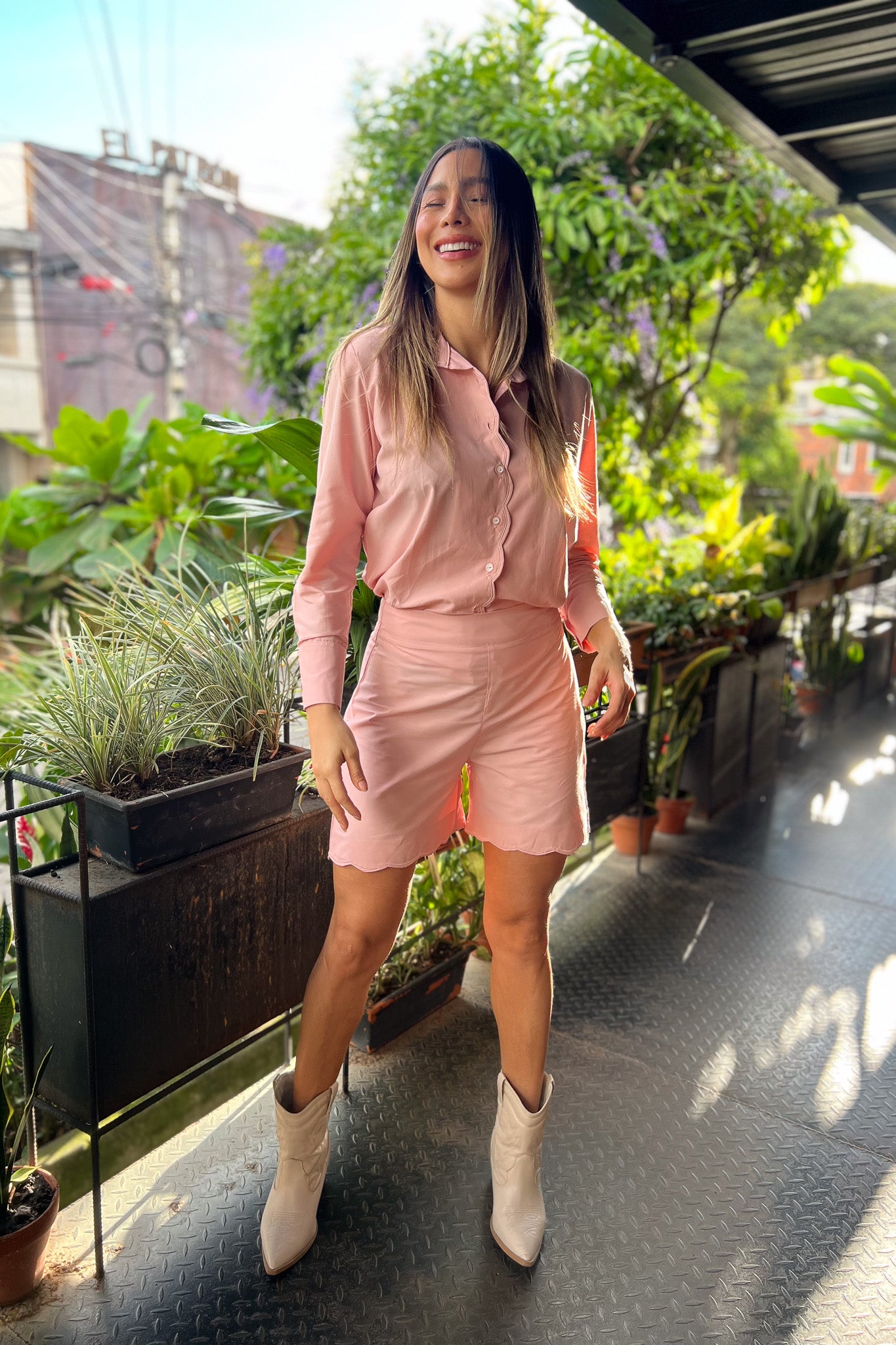 This two-piece set includes a long-sleeved shirt and Bermuda shorts with a wavy hem detail. Its soft pink hue and fresh silhouette make it a versatile and modern look, perfect for sunny days or stylish casual outings.