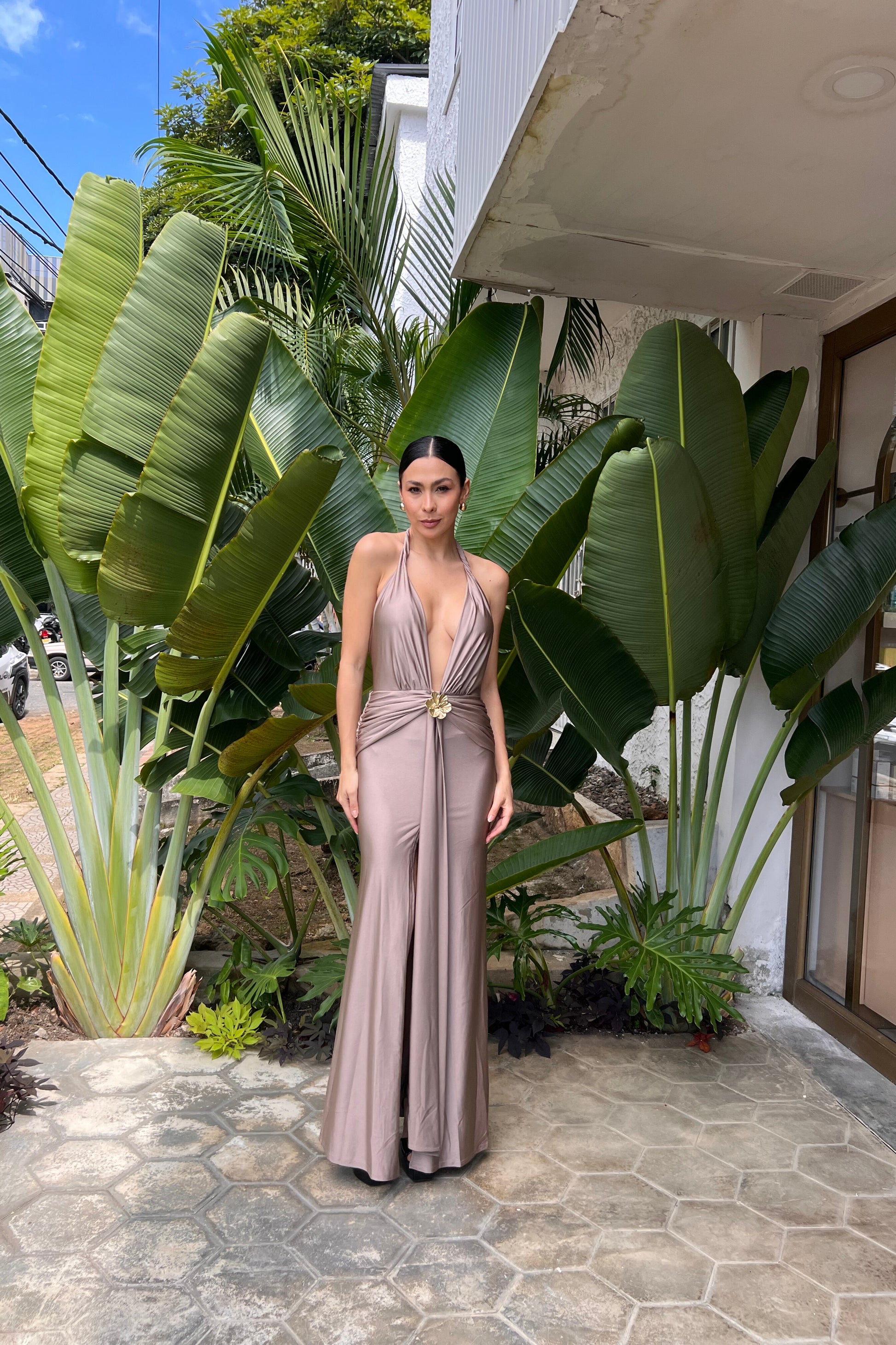 Vestido largo en tono taupe con diseño halter y escote profundo en V que estiliza la figura. La prenda cuenta con un detalle decorativo dorado en el centro, desde donde nace un drapeado que afina la cintura y aporta un efecto visual elegante. La falda amplia tipo palazzo brinda movimiento y fluidez, haciendo que el vestido luzca sofisticado y moderno. Ideal para eventos de noche o looks especiales.