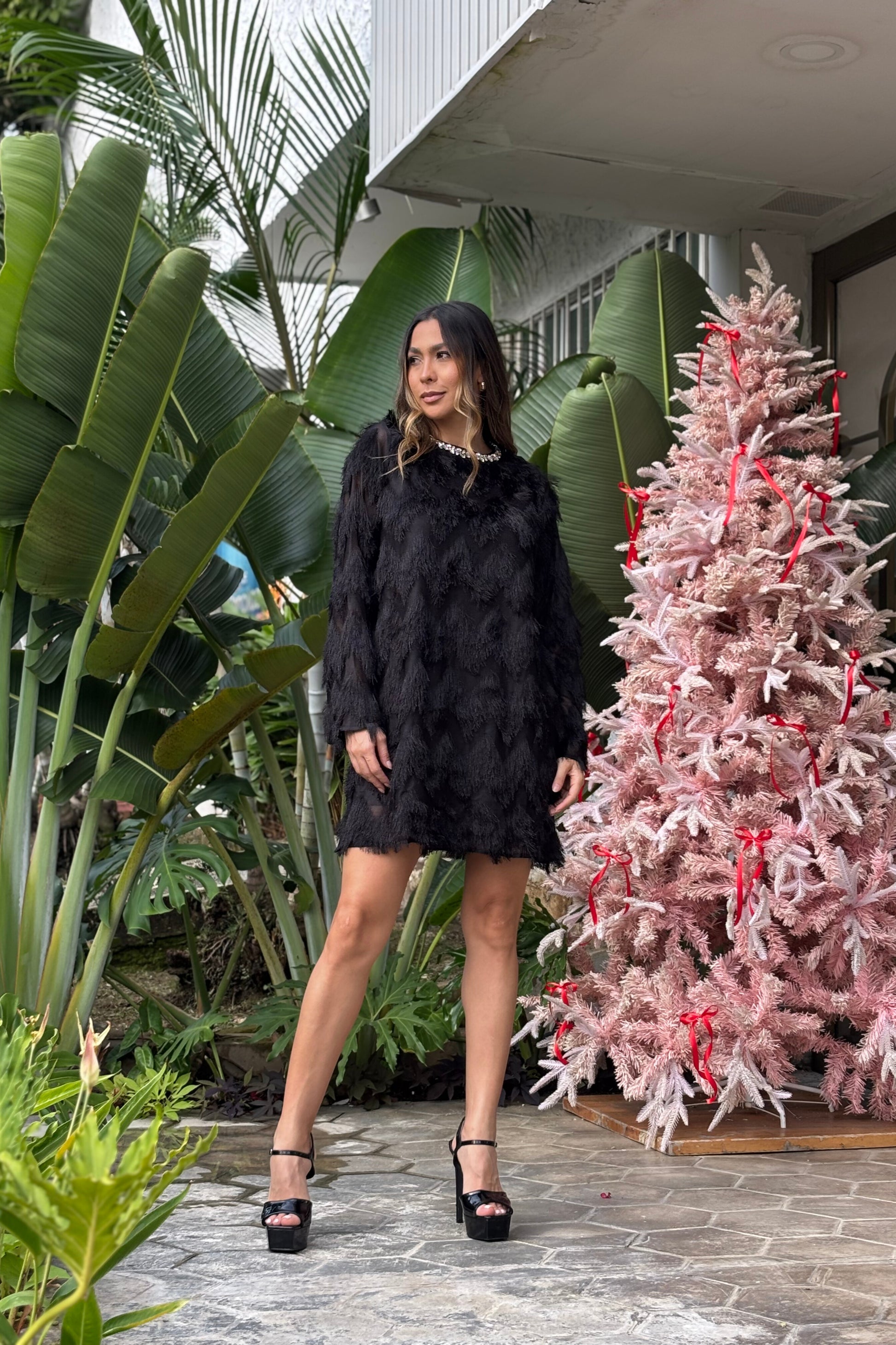 Sofisticado, moderno y lleno de textura: este vestido corto negro es la opción perfecta para destacar con estilo en cualquier ocasión especial. Su diseño presenta un acabado de flecos suaves en todo el tejido, creando un efecto voluminoso y llamativo sin perder la elegancia. Con mangas largas, cuello redondo y una silueta relajada, es una prenda chic que combina comodidad y glamour. Ideal para noches festivas, eventos formales o looks donde quieras lucir diferente y con mucha personalidad.