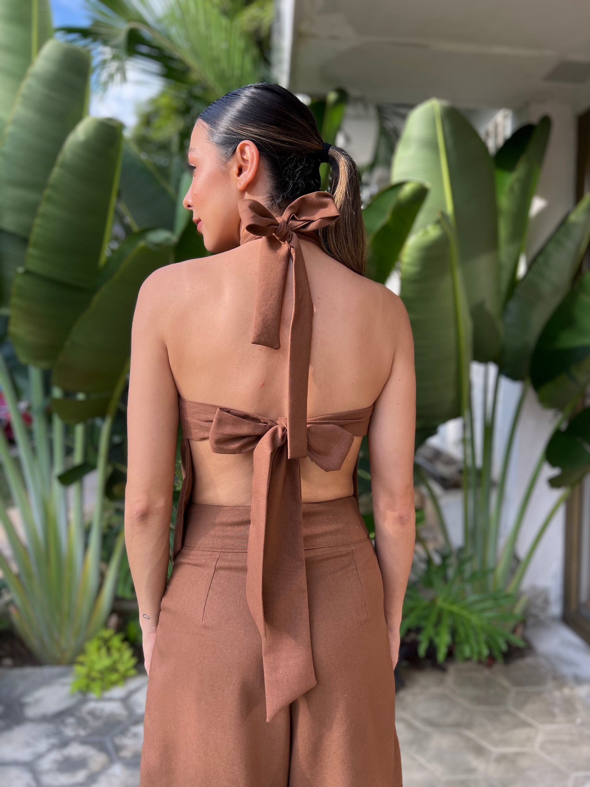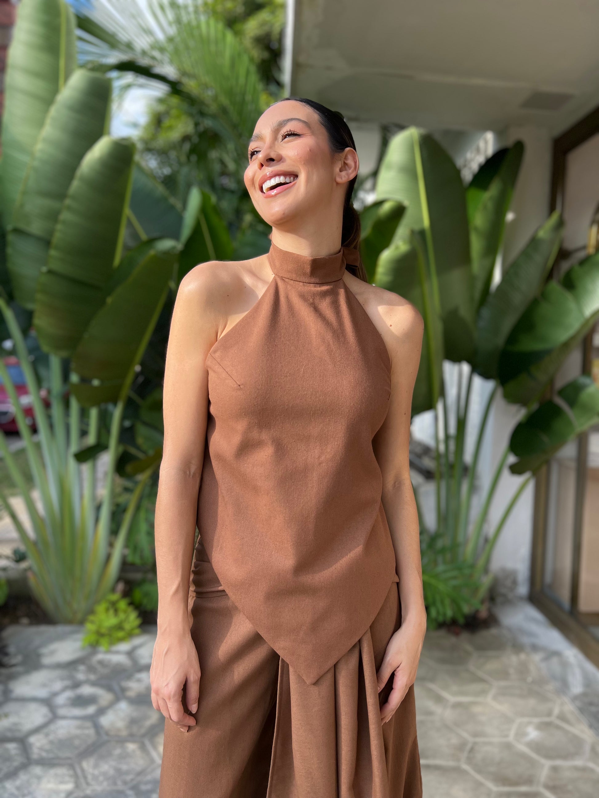 Blusa sin mangas de corte elegante con diseño halter y cuello alto que estiliza el escote y los hombros. Confeccionada en tela ligera y suave al tacto, ofrece una caída fluida que aporta sofisticación y comodidad. Su diseño minimalista la convierte en una prenda versátil, perfecta para ocasiones formales, eventos especiales o looks modernos de día y noche.