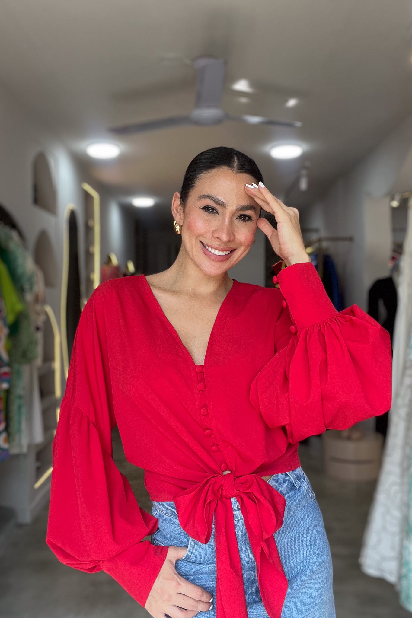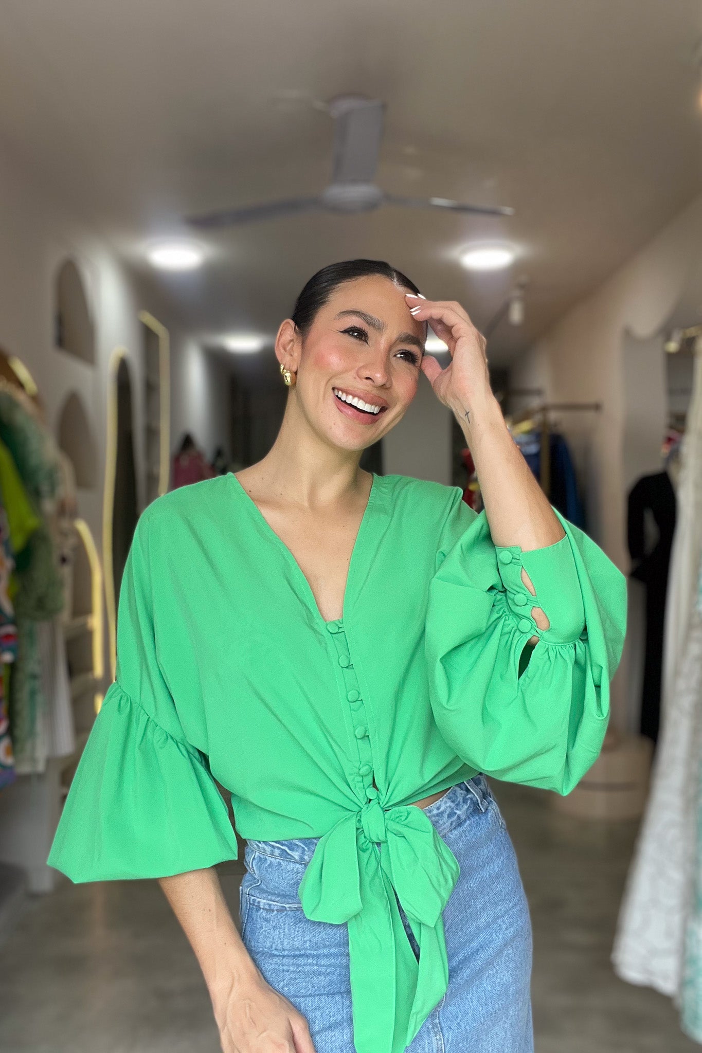 Blusa con mangas globo y botones forrados. Su lazo frontal estiliza la cintura, creando un look moderno, fresco y muy femenino.