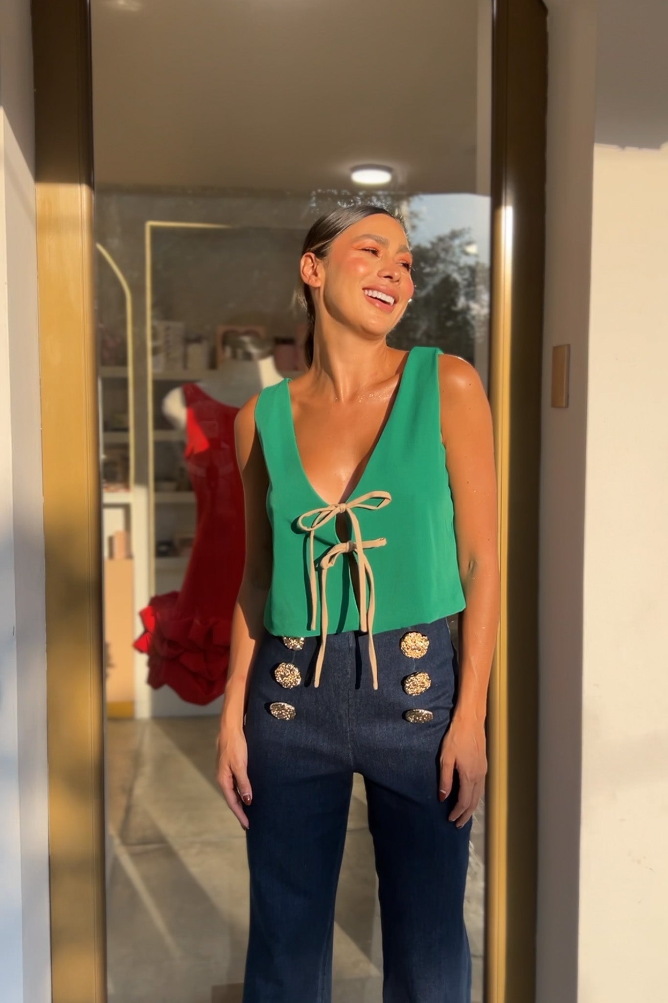 El Top Cendaña combina sencillez y encanto con su lazo frontal ajustable y escote profundo. Una prenda fresca y femenina que realza tu estilo natural en cualquier ocasión.