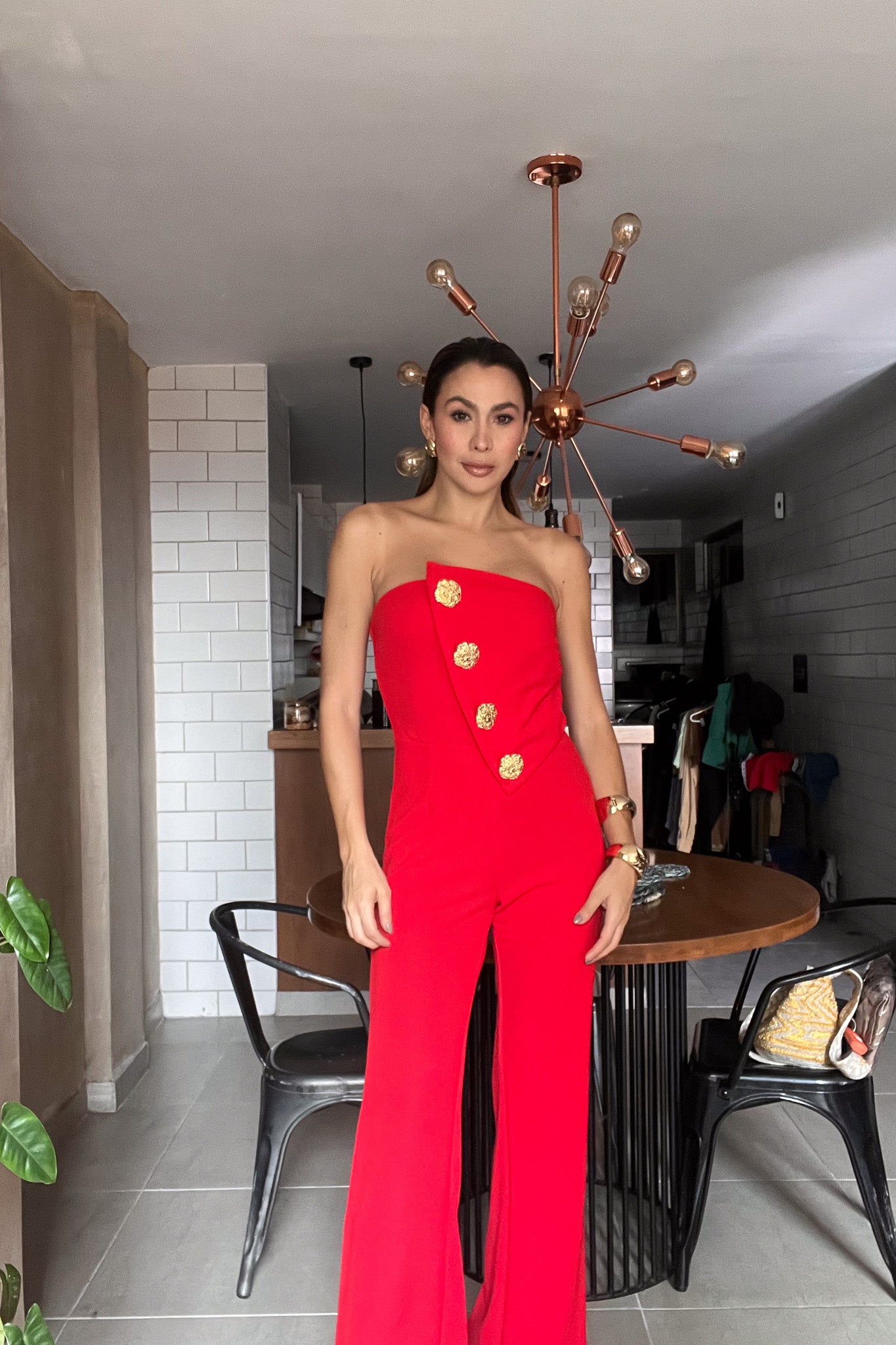 Enterizo strapless en tono rojo intenso con botones dorados decorativos. Su silueta estilizada y corte tipo palazzo realzan la figura con elegancia y fuerza, ideal para eventos o cenas especiales.