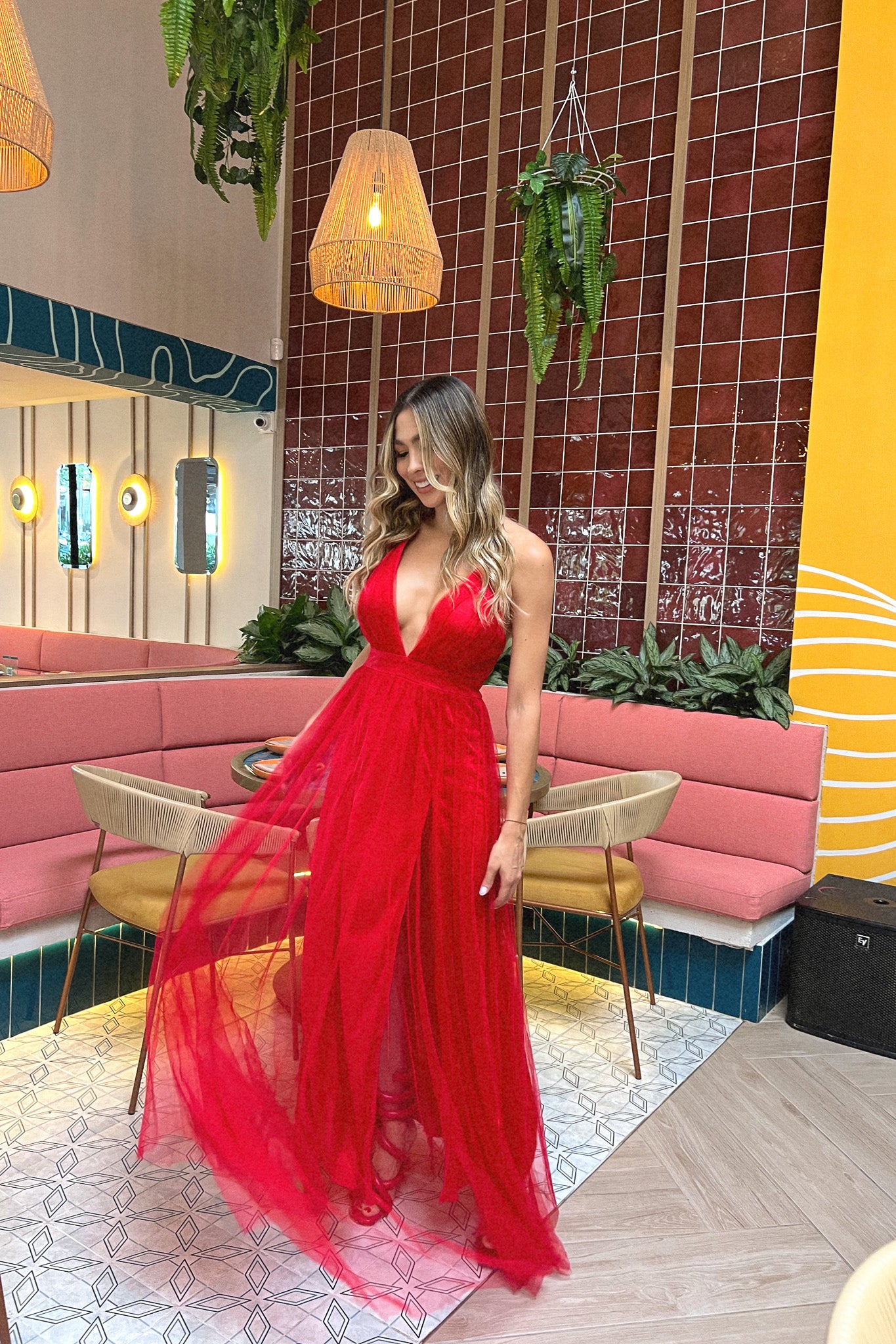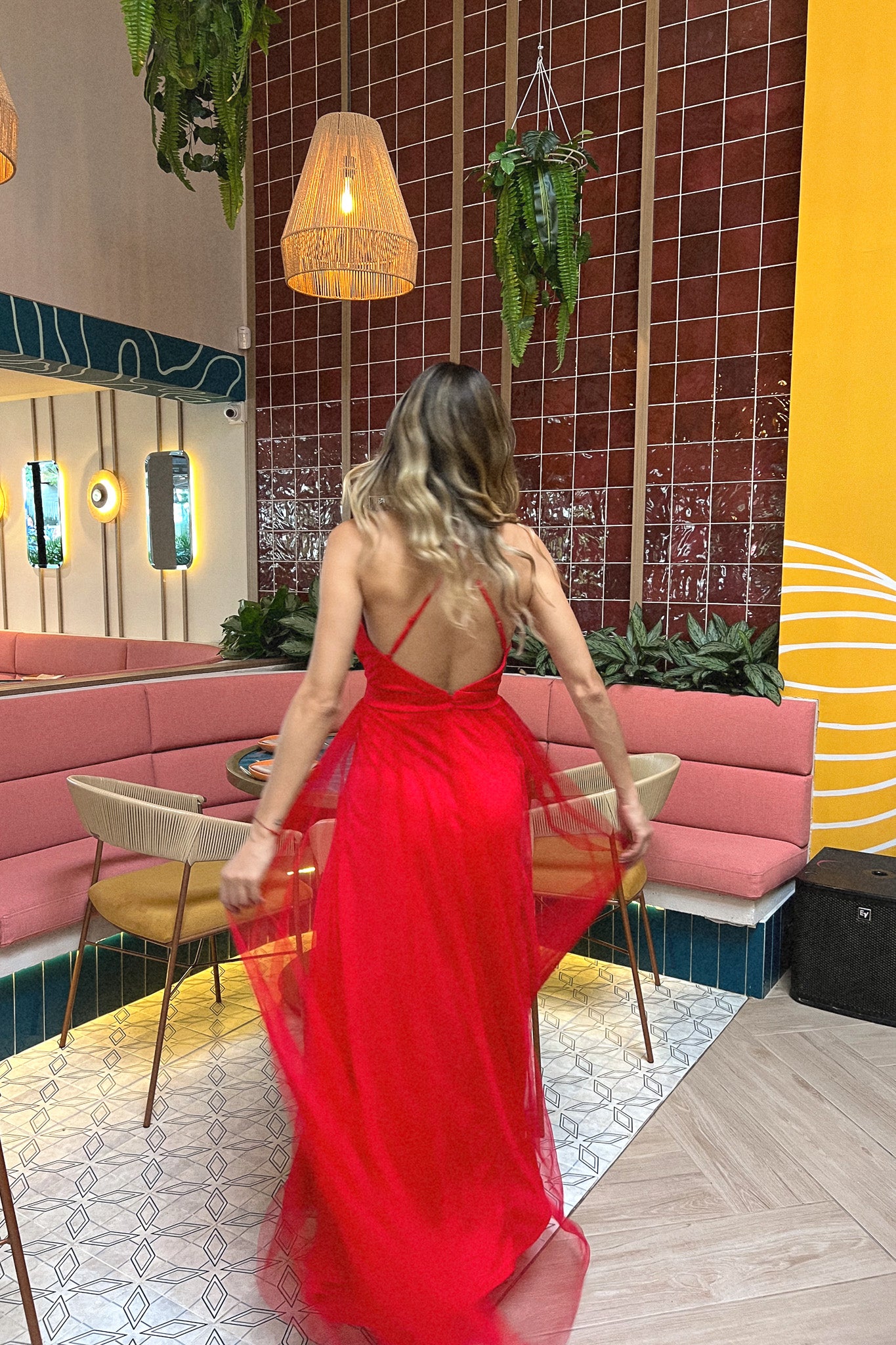Vestido largo en tul color rojo con escote profundo y falda fluida. Su diseño romántico y elegante resalta la silueta con sutileza y movimiento, ideal para eventos de noche, cenas o celebraciones especiales.