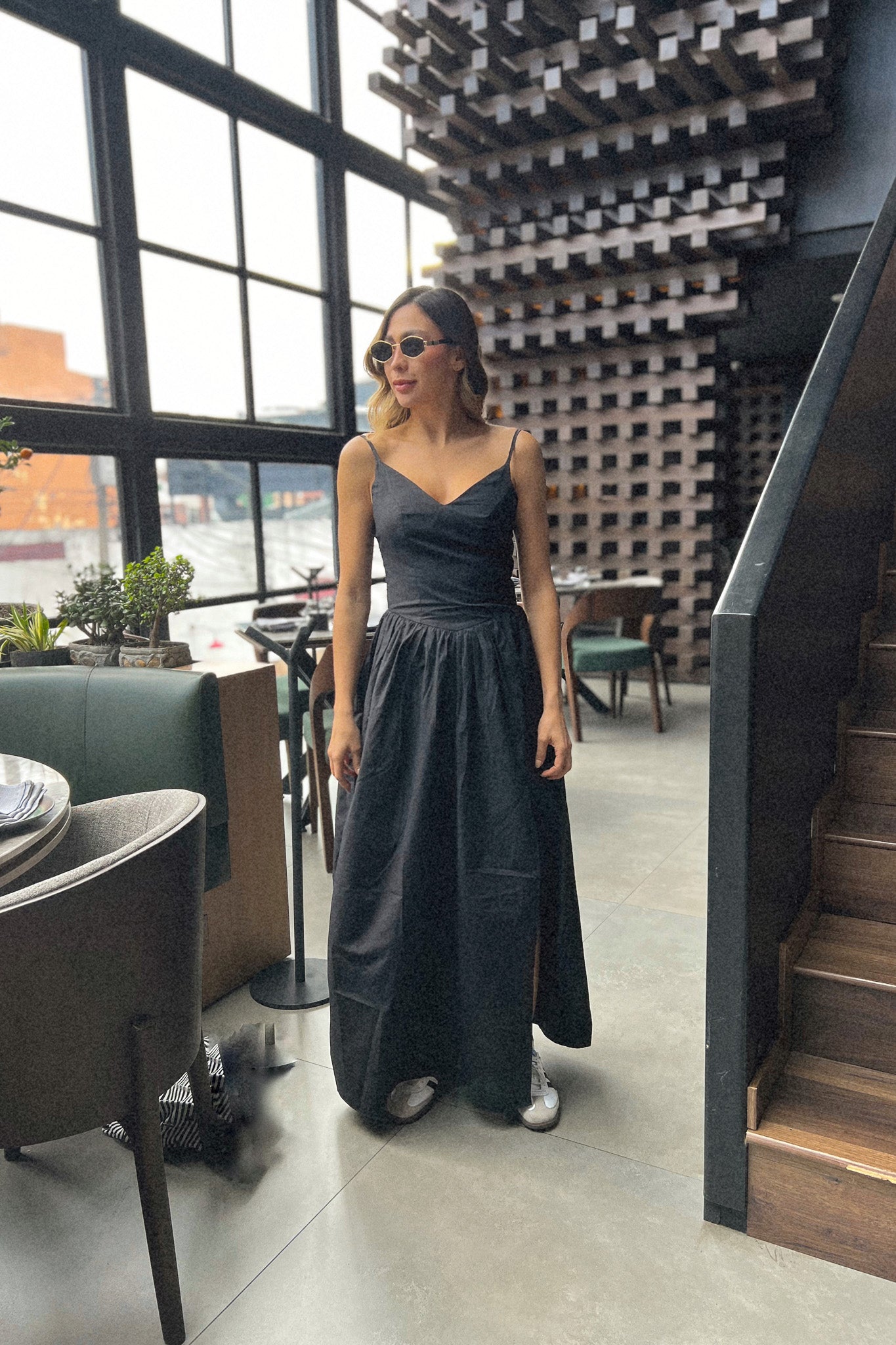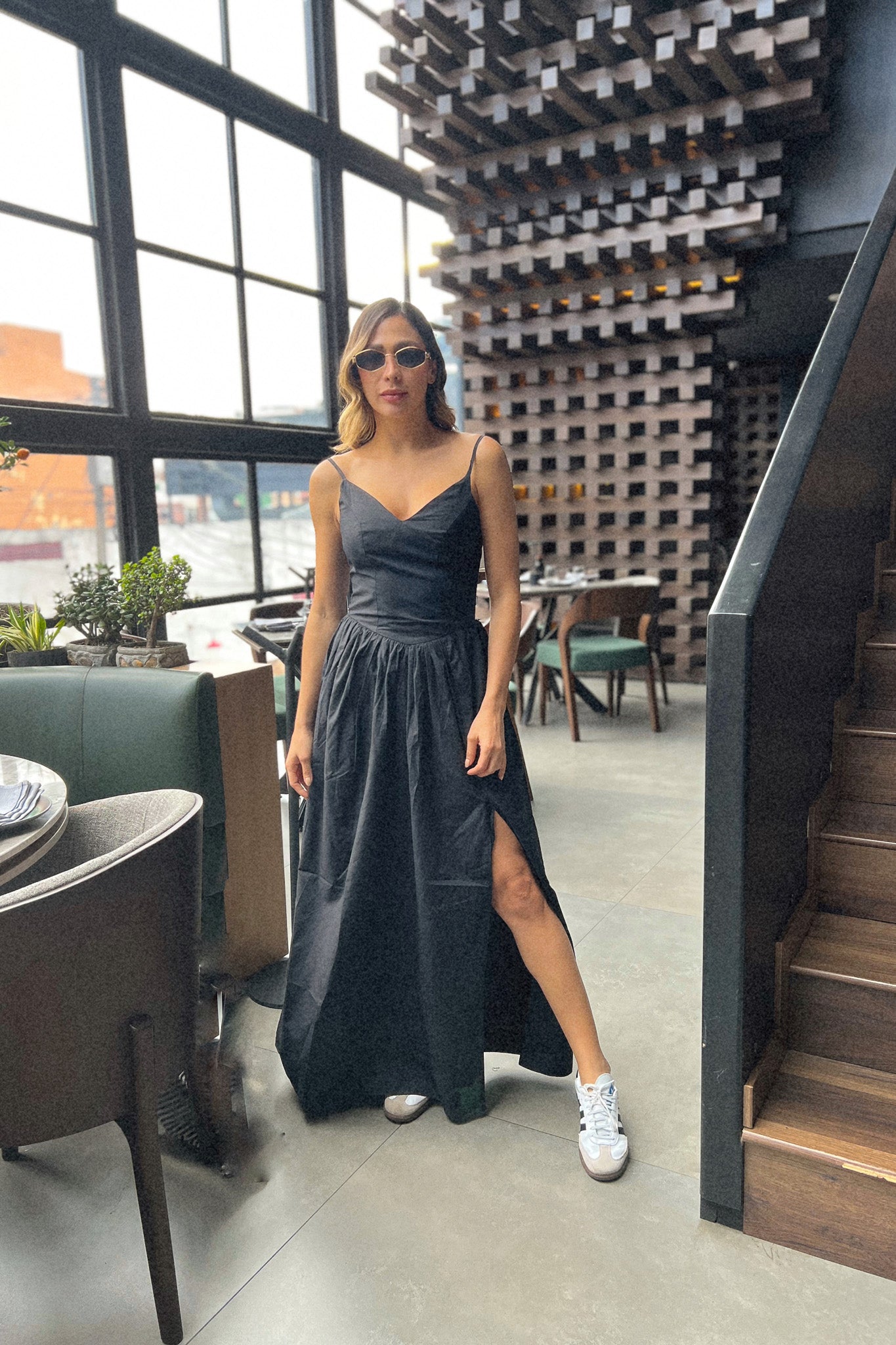 Vestido largo en popelina color negro, con tiras delgadas y escote cruzado. Su falda amplia y abertura lateral crean una silueta elegante y atemporal. Perfecto para cenas, eventos o looks de noche con un toque sofisticado.