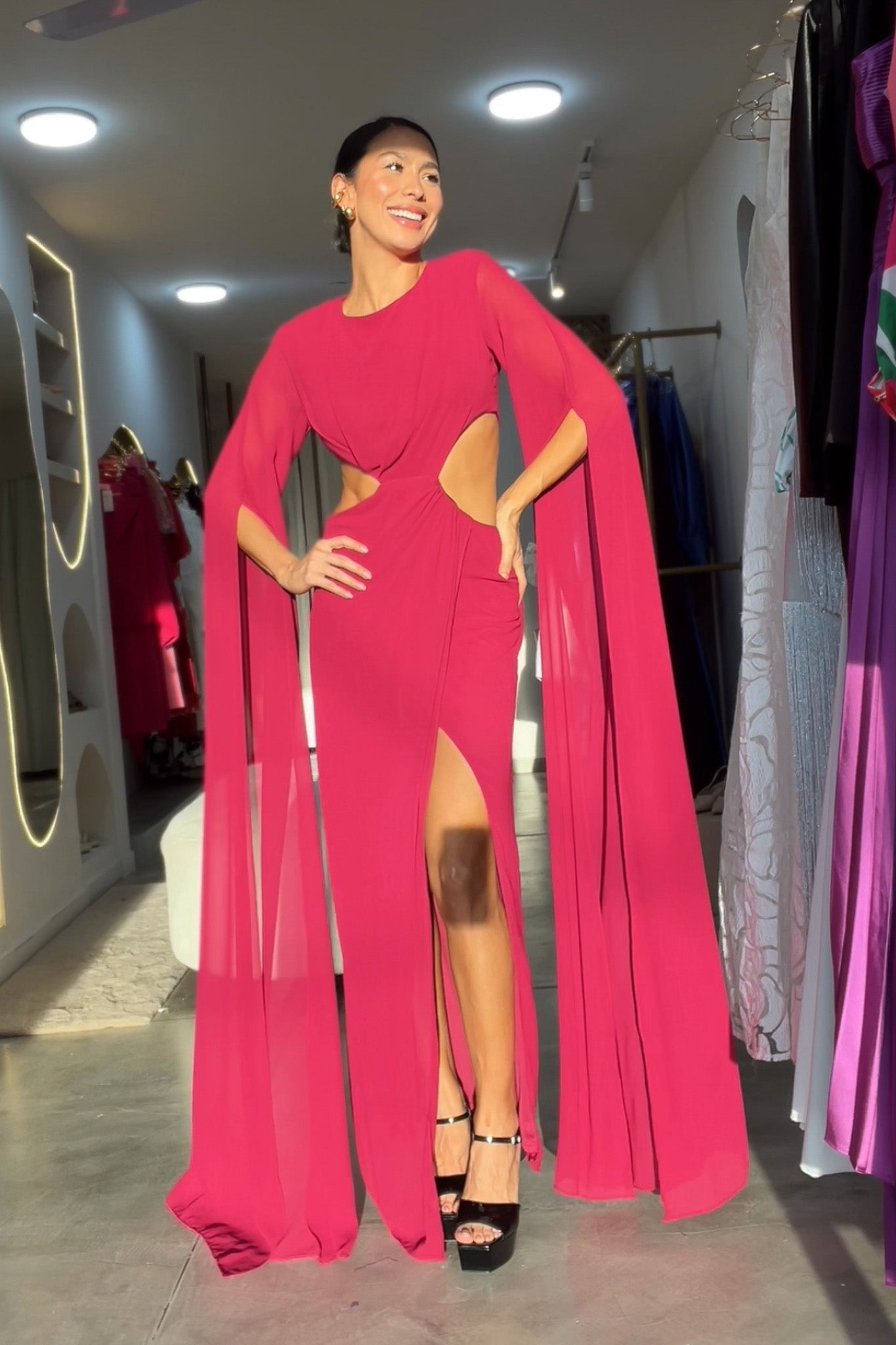 Un vestido que roba miradas. Su silueta fluida, aberturas laterales y mangas largas con caída elegante crean un look de impacto lleno de glamour y fuerza femenina.