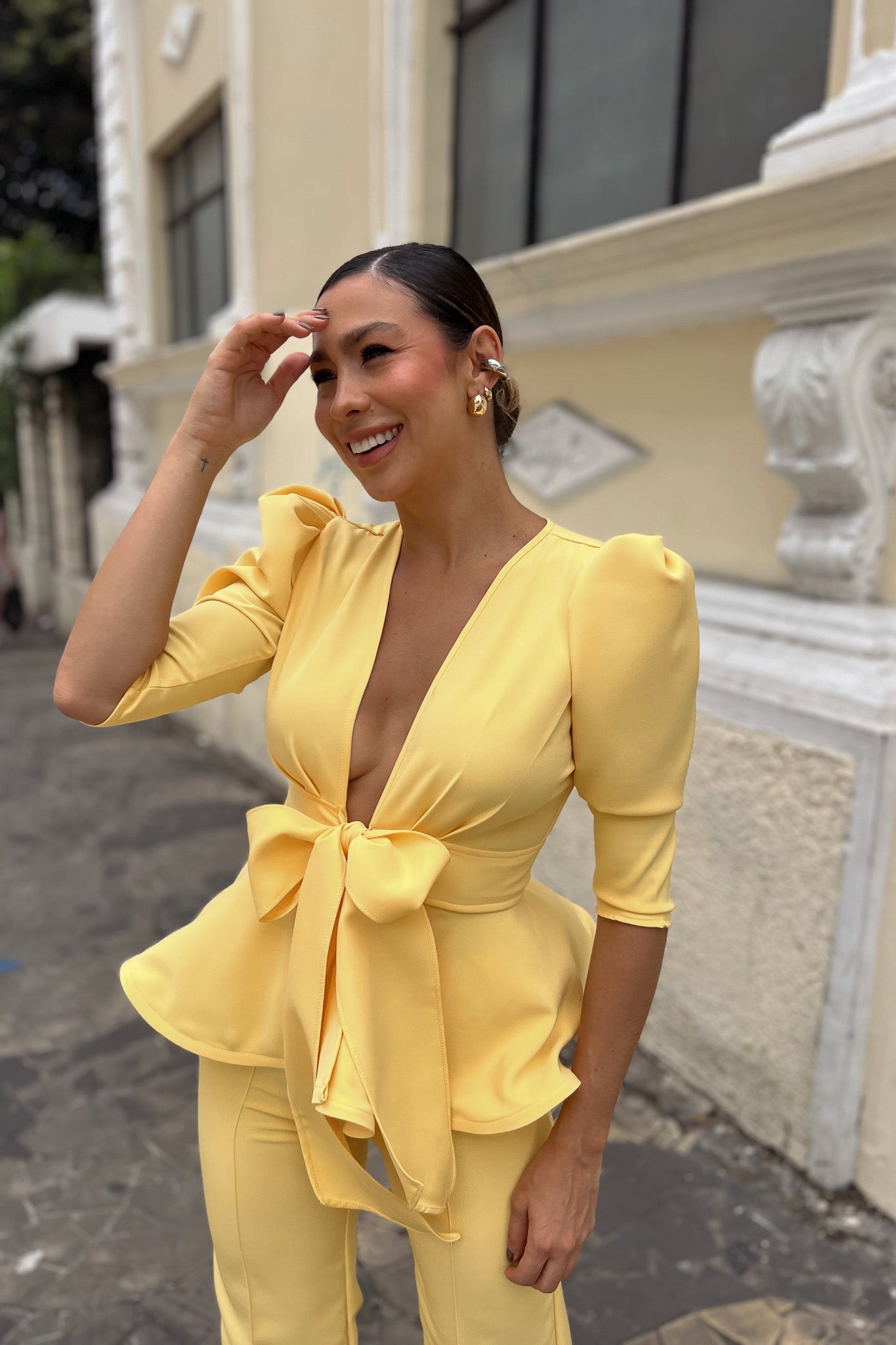 Set en tono amarillo suave, blanco, chocolate, negro, vino tinto; con blazer de lazo estructurado y pantalón bota recta. Su silueta elegante y luminosa resalta la seguridad y estilo de quien lo lleva, ideal para ocasiones especiales o looks de impacto.