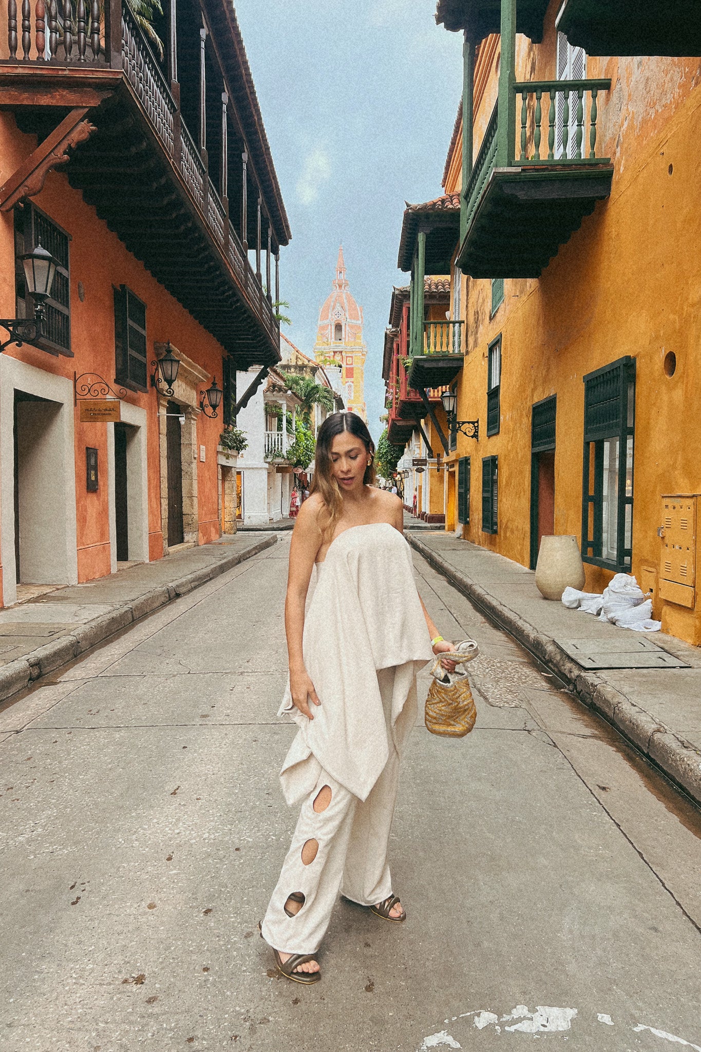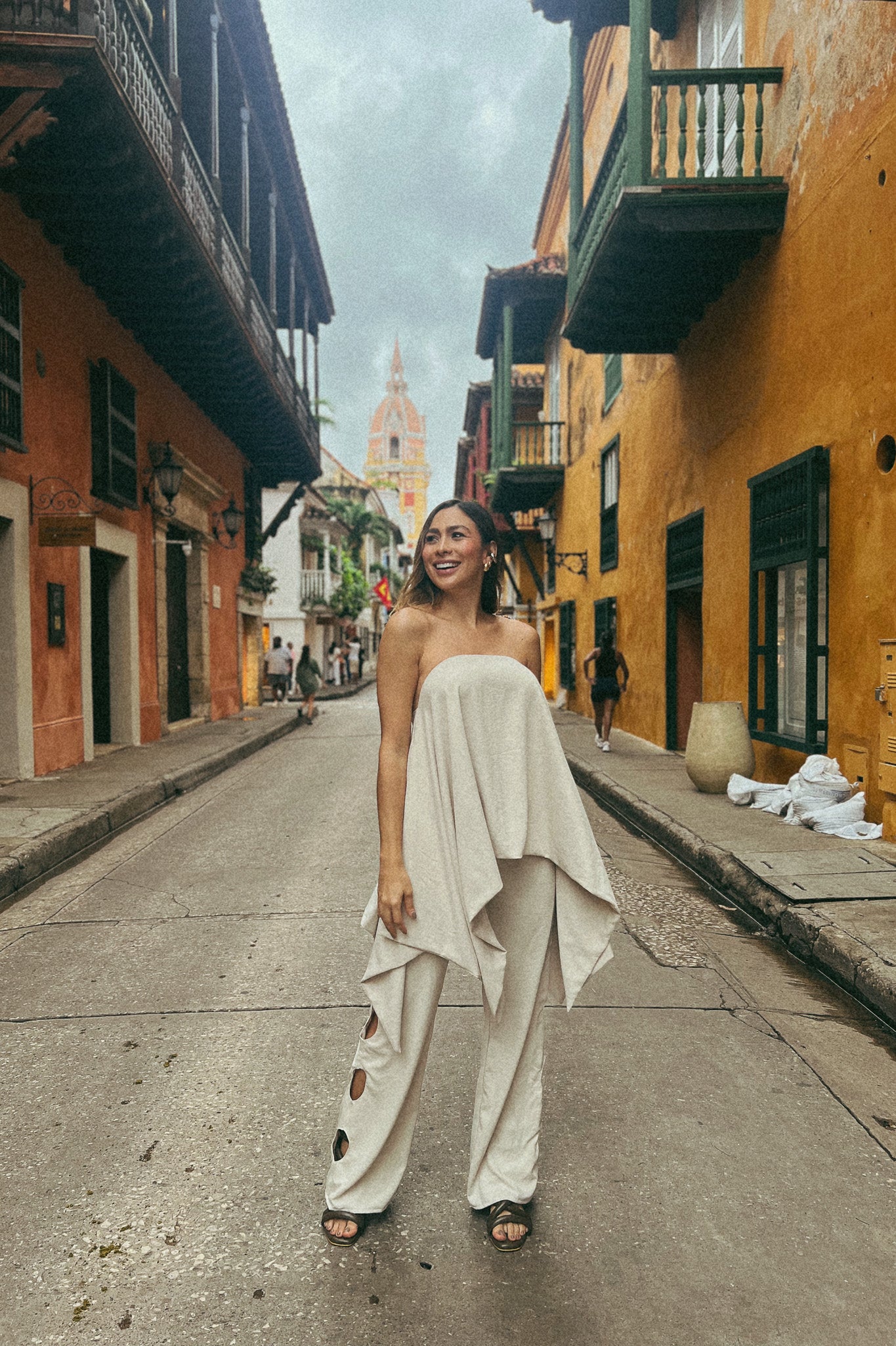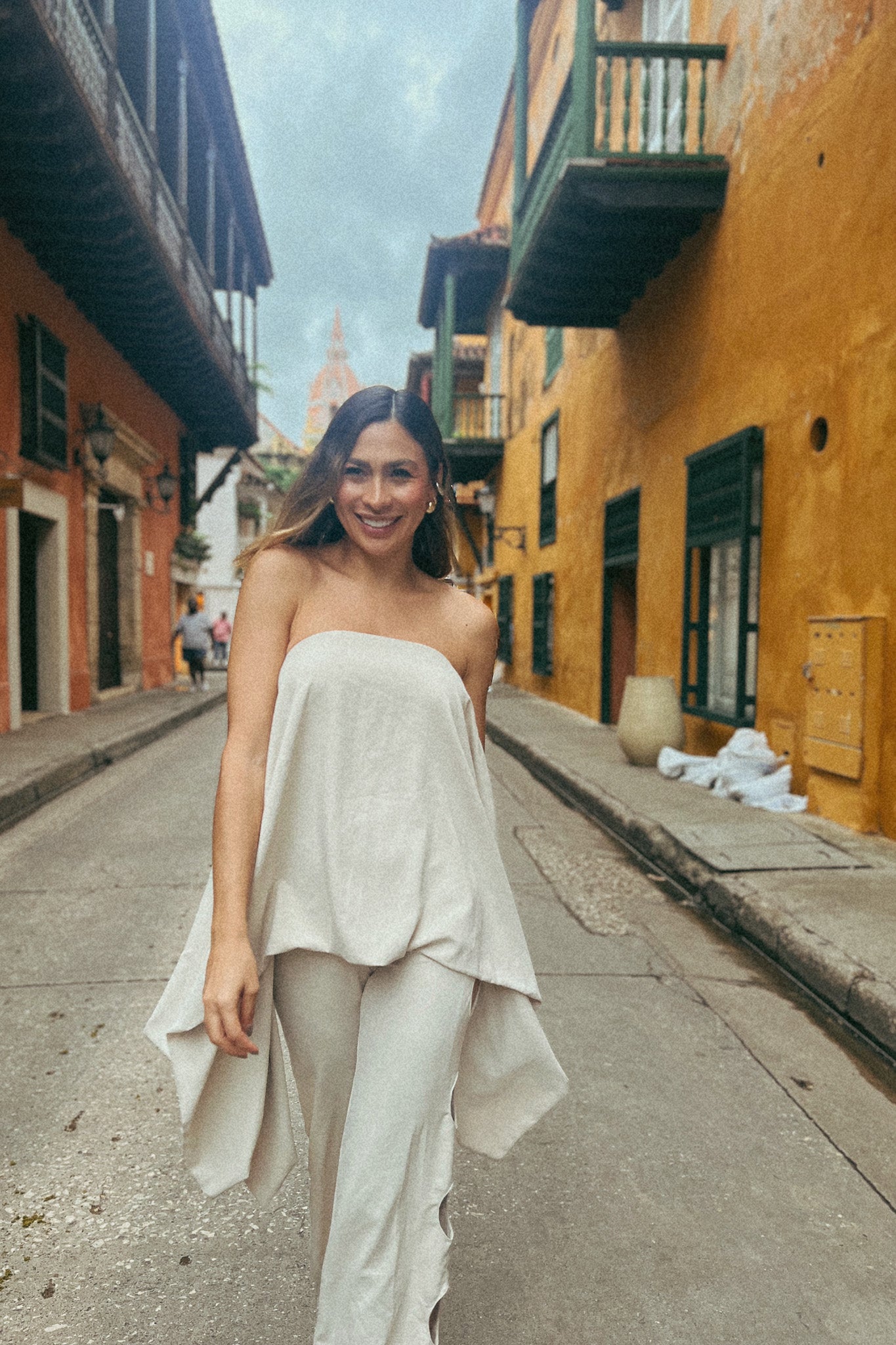 Set en tono arena y set tono negro con top tipo ruana asimétrica y pantalón ancho con aberturas laterales. Su diseño fluido y natural transmite elegancia relajada, perfecto para días cálidos con estilo.