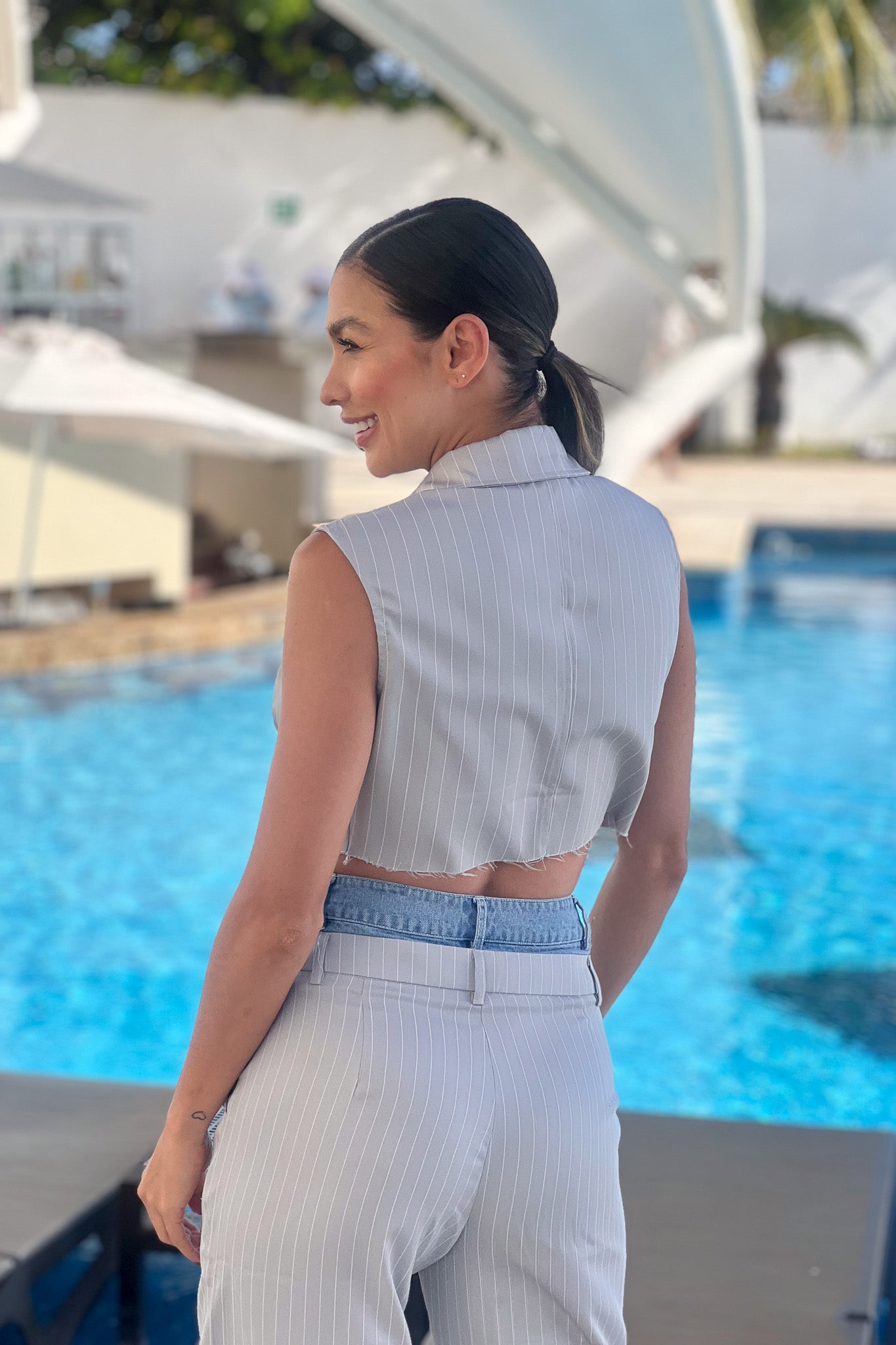 Set dos piezas en tela ligera con diseño de rayas elegantes. Un conjunto versátil y moderno que resalta la silueta con sofisticación y comodidad.