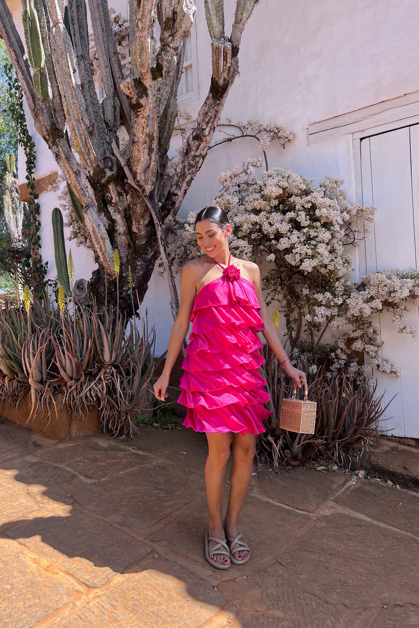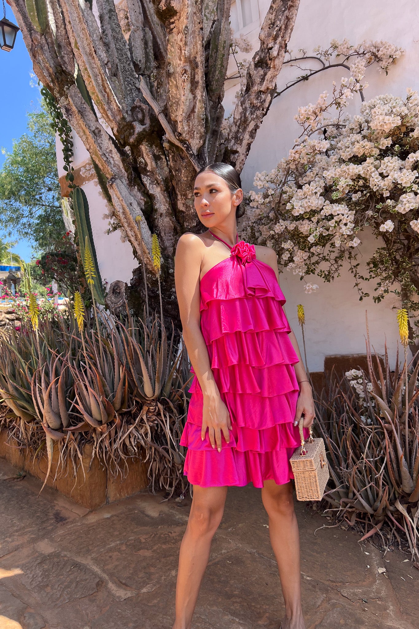 Vestido con escote halter adornado con flor y capas tipo gola que crean un efecto fluido y romántico. Disponible en blanco y fucsia, es ideal para eventos o celebraciones donde quieras destacar con un look femenino y encantador.