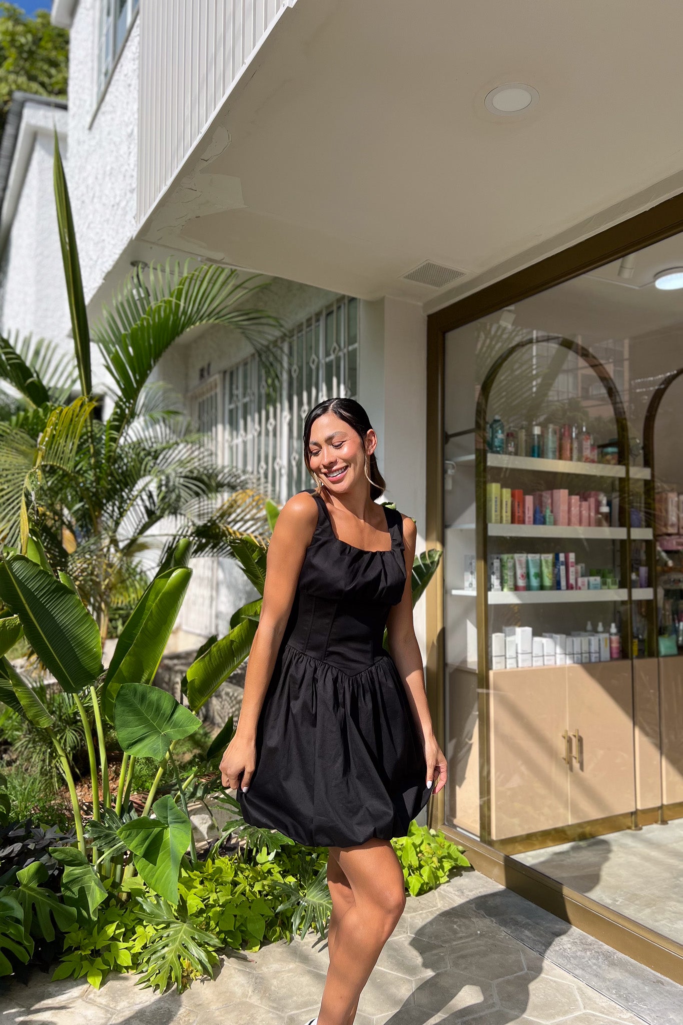 Vestido corto con diseño tipo corset que define la cintura y falda globo. Su estructura realza la figura y el color suave aporta frescura y feminidad, ideal para ocasiones especiales o eventos de día.